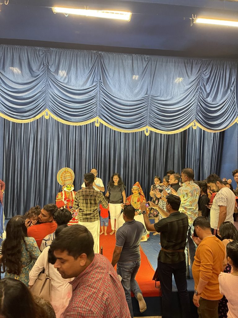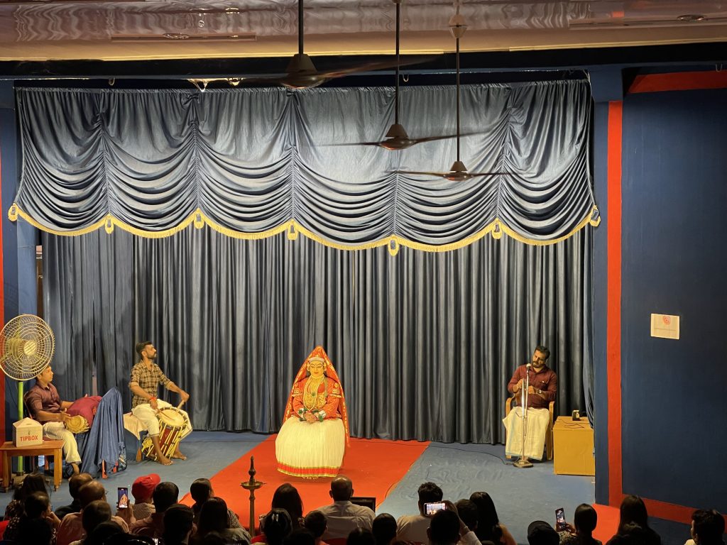 Wir sehen eine Aufführung der Kathakali, einer alten, indischen Tanzform. Die aufwendig geschminkten Figuren erzählen Geschichten aus Hindu-Epen.
