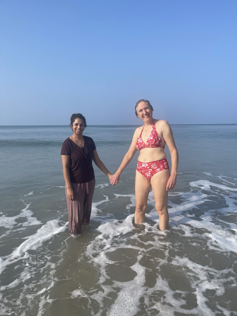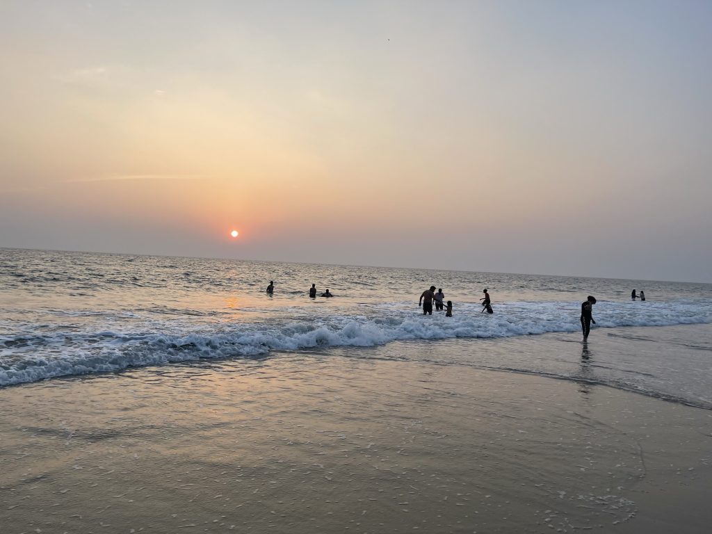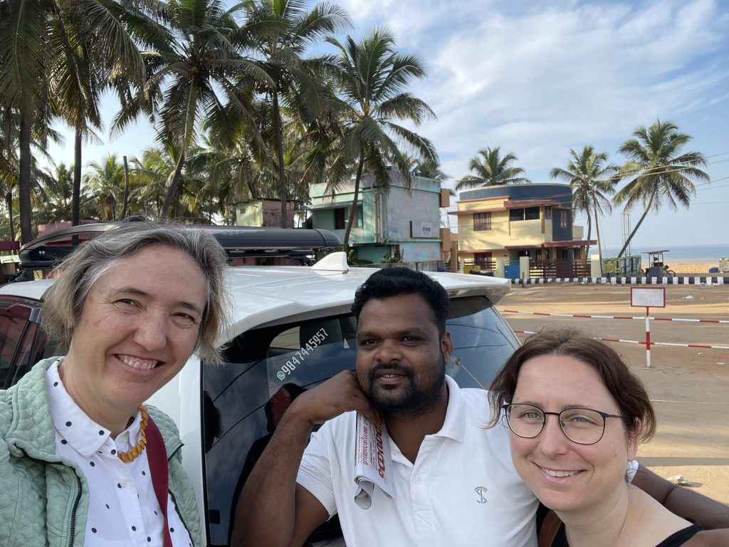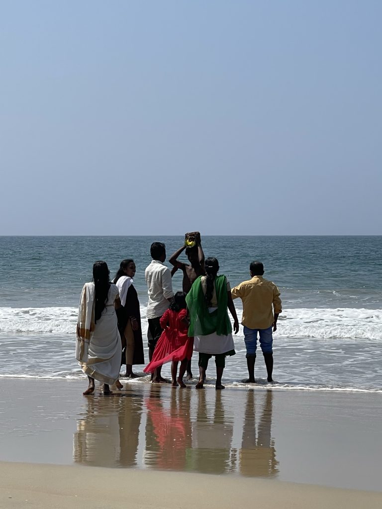 Das Meer ist herrlich warm mit ca. 25 Grad. Die Inder gehen auch gerne an den Strand, können aber meistens nicht schwimmen und gehen mit ihrer Kleidung ins Wasser. So helfe ich einer jungen Frau ins Wasser, die das erste Mal am Strand ist. Sie freut sich sehr darüber, hat aber viel Angst. Der Strand ist „holy“ und es finden Hindu Rituale statt.