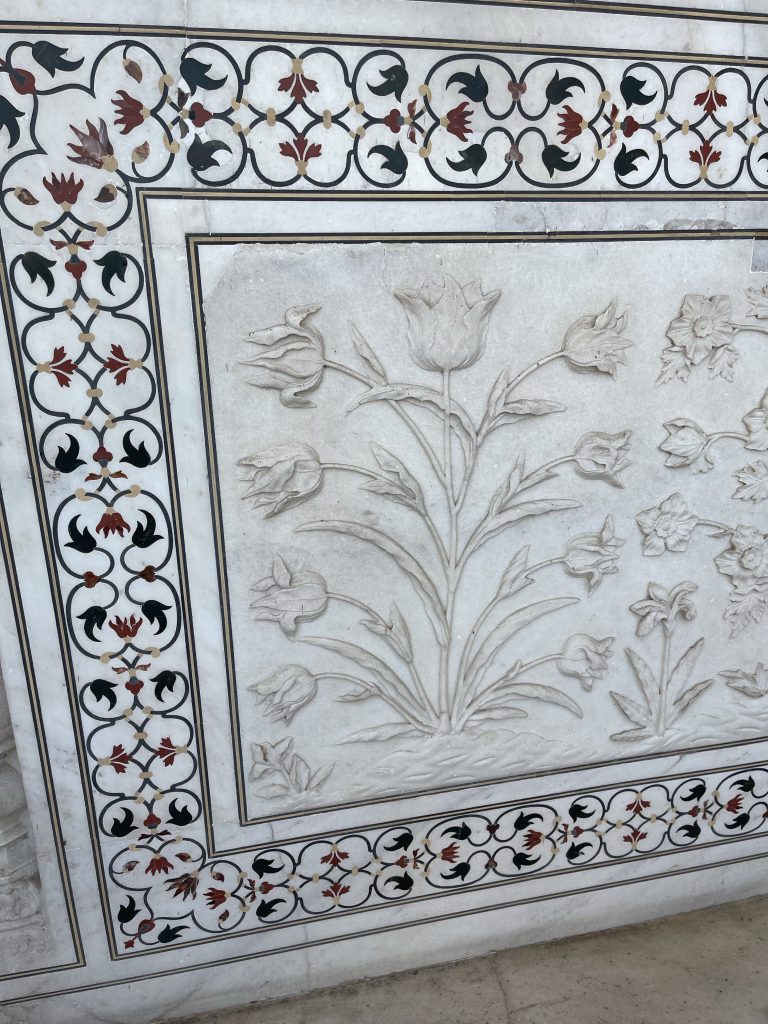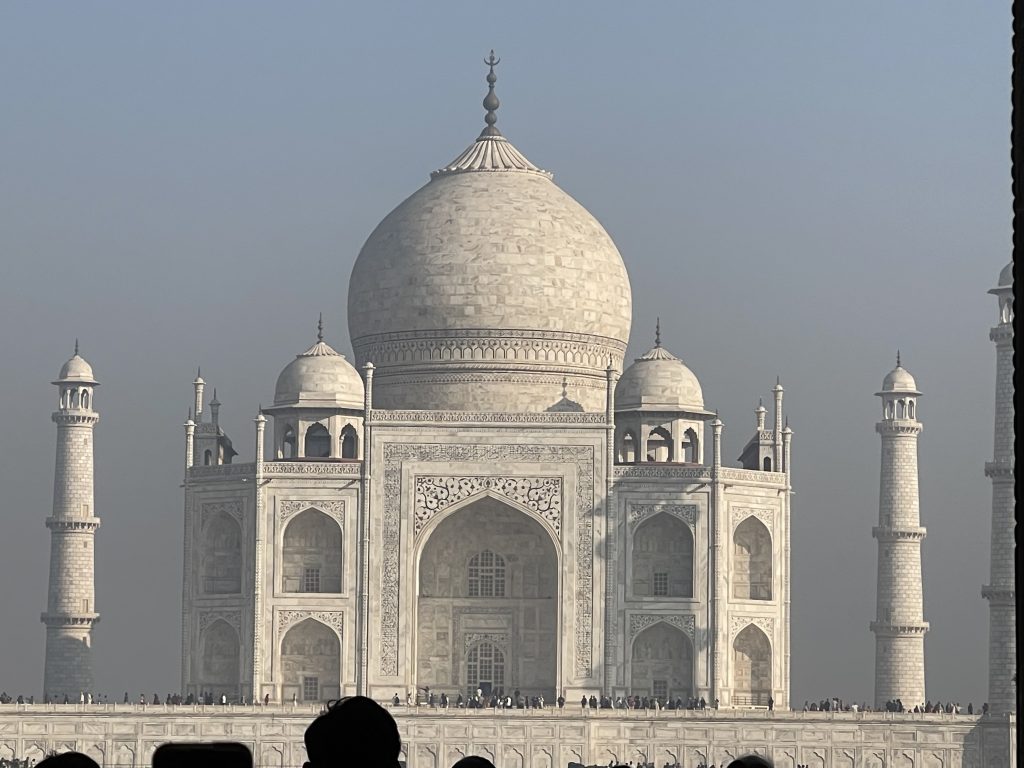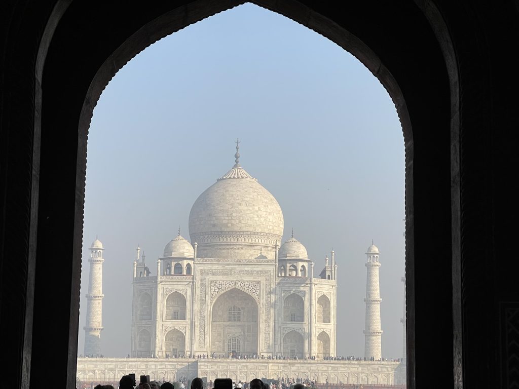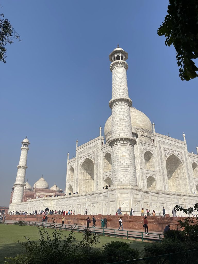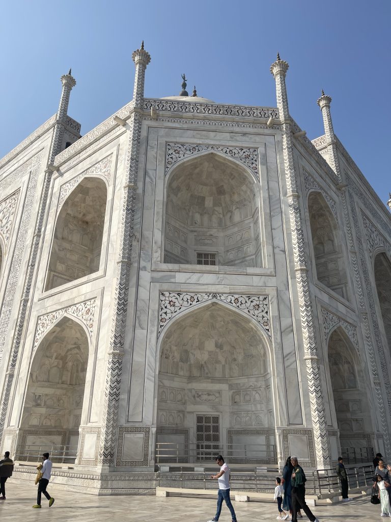 Wir fahren mit dem Auto von Jaipur nach Agra, das ca. 250 km östlich liegt. Dort befindet sich das berühmte Taj Mahal. Morgens gegen 9 Uhr sind wir dort und betreten das Gelände. Nach einem „Taschenchaos“ beim Eintritt sind wir im Areal. Auch hier natürlich viele, viele Touristen aus aller Welt. Unser Führer kennt die guten Foto Spots, so dass tolle Fotos aus unterschiedlichen Perspektiven entstehen. Beim Taj Mahal handelt es sich um ein Mausoleum, so dass innen nicht viel zu besichtigen ist. Das ganze Gebäude besteht aus Marmor aus der Region. Aufgrund dieses Materials, der Harmonie (alles ist symmetrisch), der exponierten Lage, keiner weiteren Bauten in der Umgebung und der schieren Größe, sieht das Gebäude ganz unwirklich aus. Wie aus einer Filmkulisse