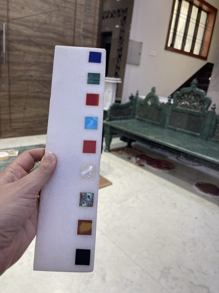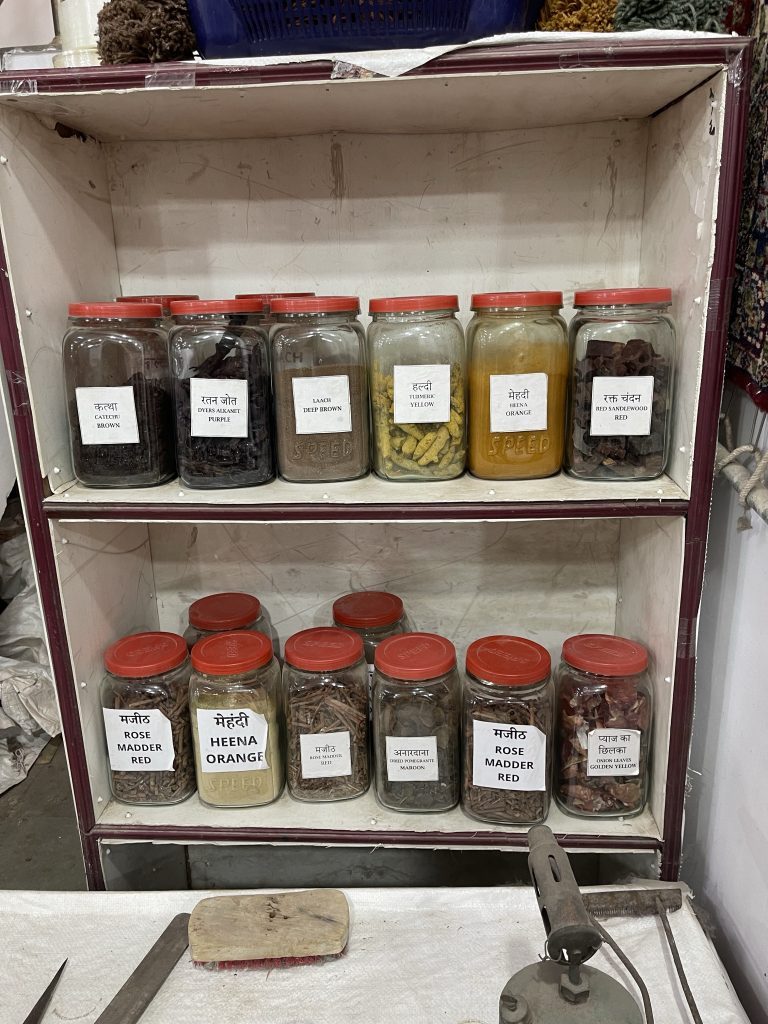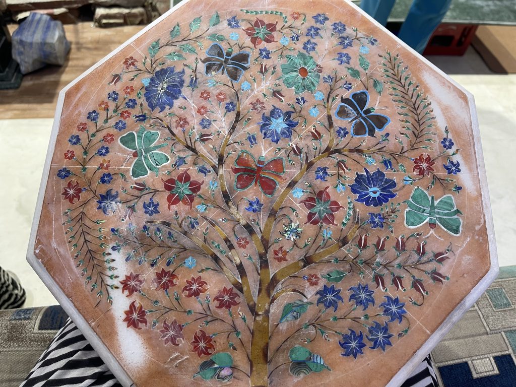 In Jaipur und Agra besichtigen wir viele „factories“ mit anschließenden Verkaufsräumen. Sicherlich ein typisches Touristending, aber ich bin beeindruckt davon, wie in Indien noch (Kunst)-handwerk betrieben wird. Dabei vermischen sich die Kunstrichtungen und Arbeitstechniken aus dem Hinduismus, von den Maharadschas als auch aus Afghanistan und Persien (Mogulen). Die Mogulen waren islamisch und haben lange in Nordindien geherrscht. Ich denke, dass sich so Handfertigkeiten vermischt und gegenseitig bereichert haben. Dazu kommt, dass Rajastan reich an Bodenschätzen ist: Marmor, Halbedelsteine wie Saphire, Topaz usw. Die Farben zum Färben von Stoffen und Wollen stammen von den heimischen Pflanzen wie Kurkuma.