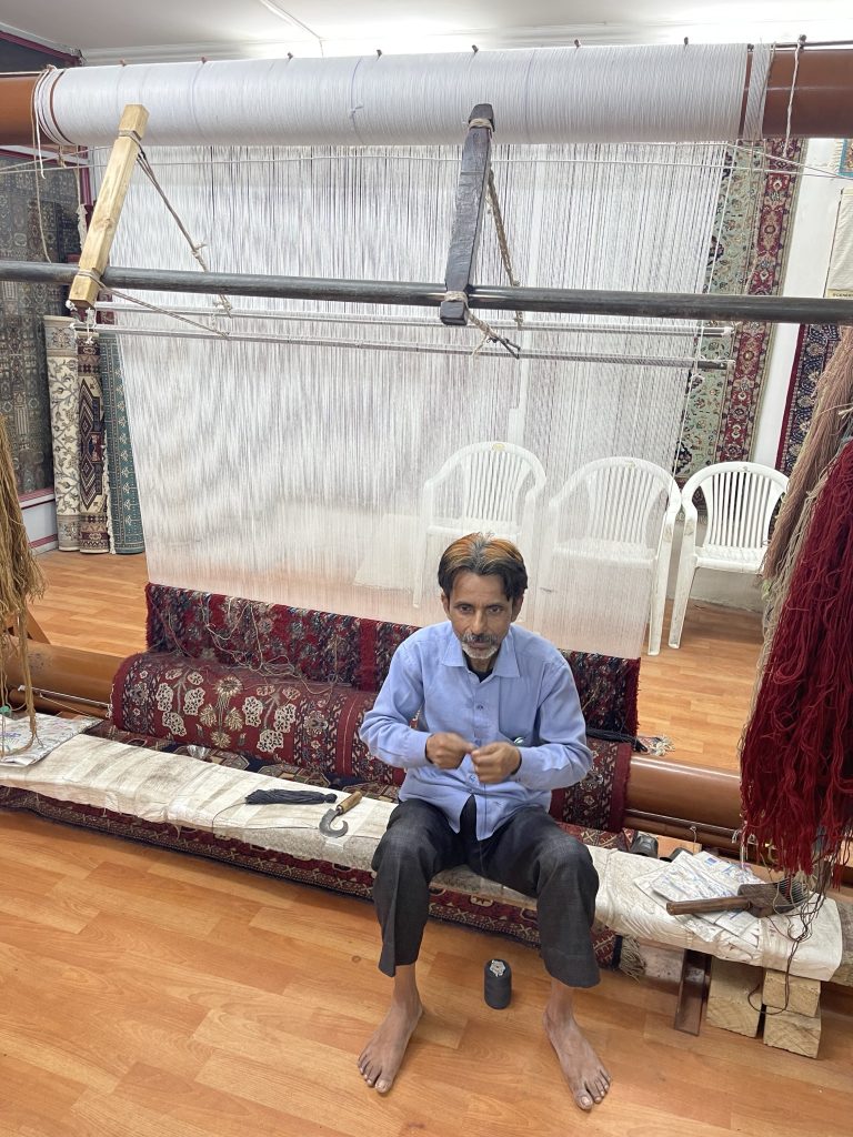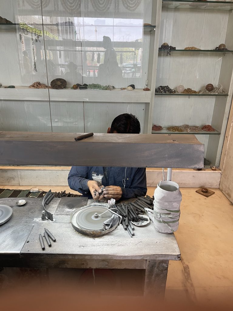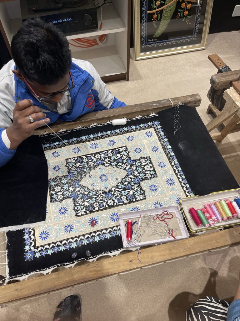 Das Kunsthandwerk ist aufgrund der billigen Arbeitskräfte sehr günstig vom Preis. In Deutschland würde es ein Vielfaches kosten. Häufig sitzen die Arbeiter im Schneidersitz unter den niedrigen Tischen und arbeiten mit großer Konzentration und Hingabe. Wir erstehen einige Stücke unter anderem bedruckte Stoffe und Tücher aus Kaschmir. Kaschmir ist eine Region aus dem Norden von Indien, politisch instabil aufgrund der Grenze zu Pakistan. Die Wolle stammt von Bergziegen.