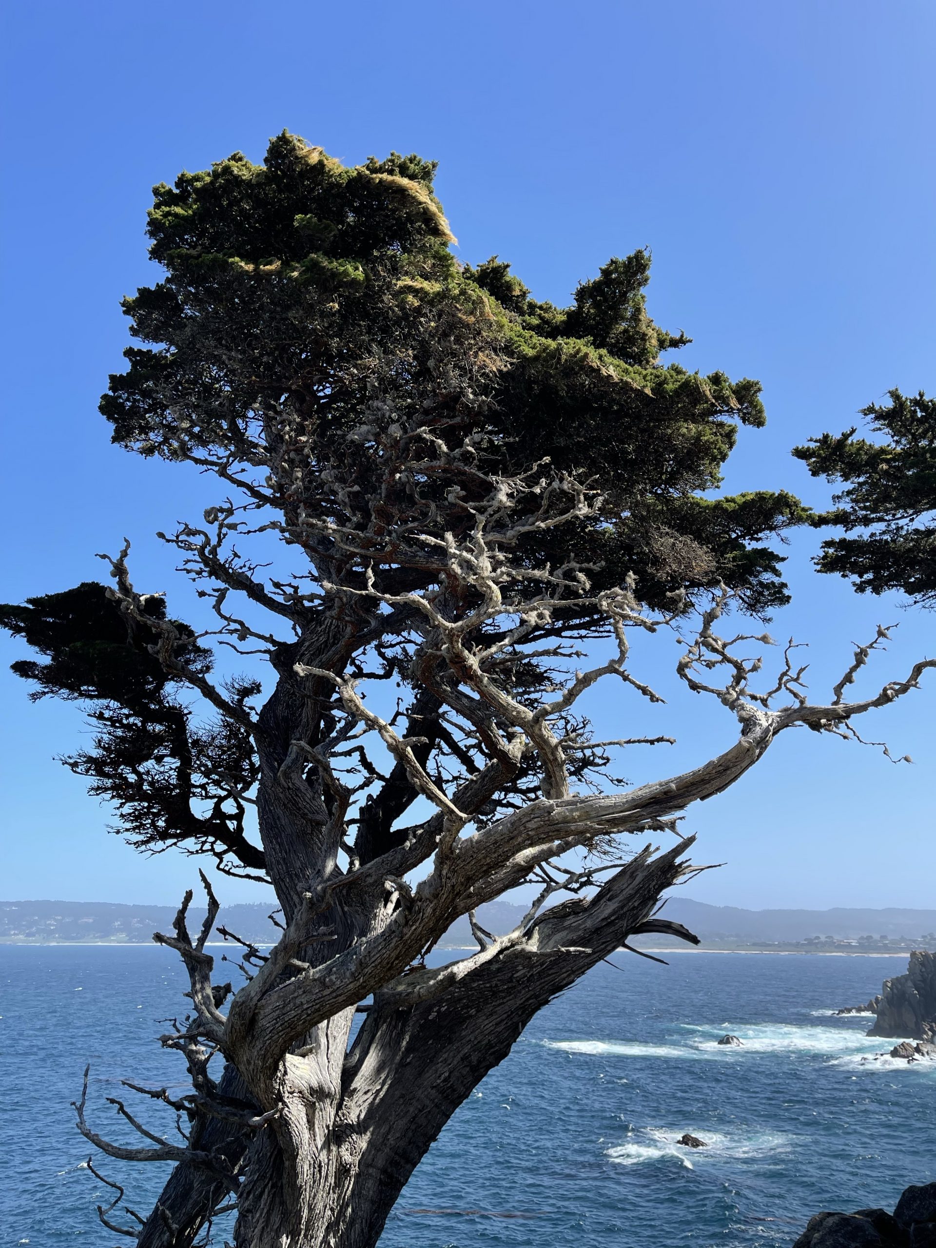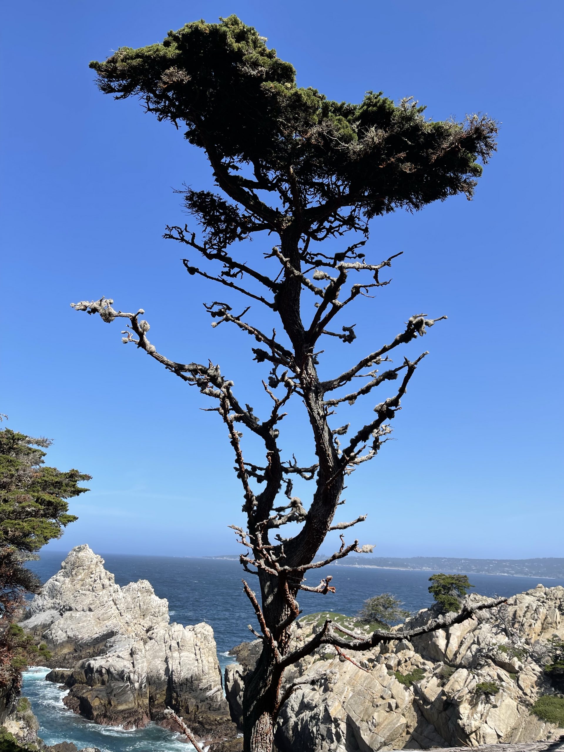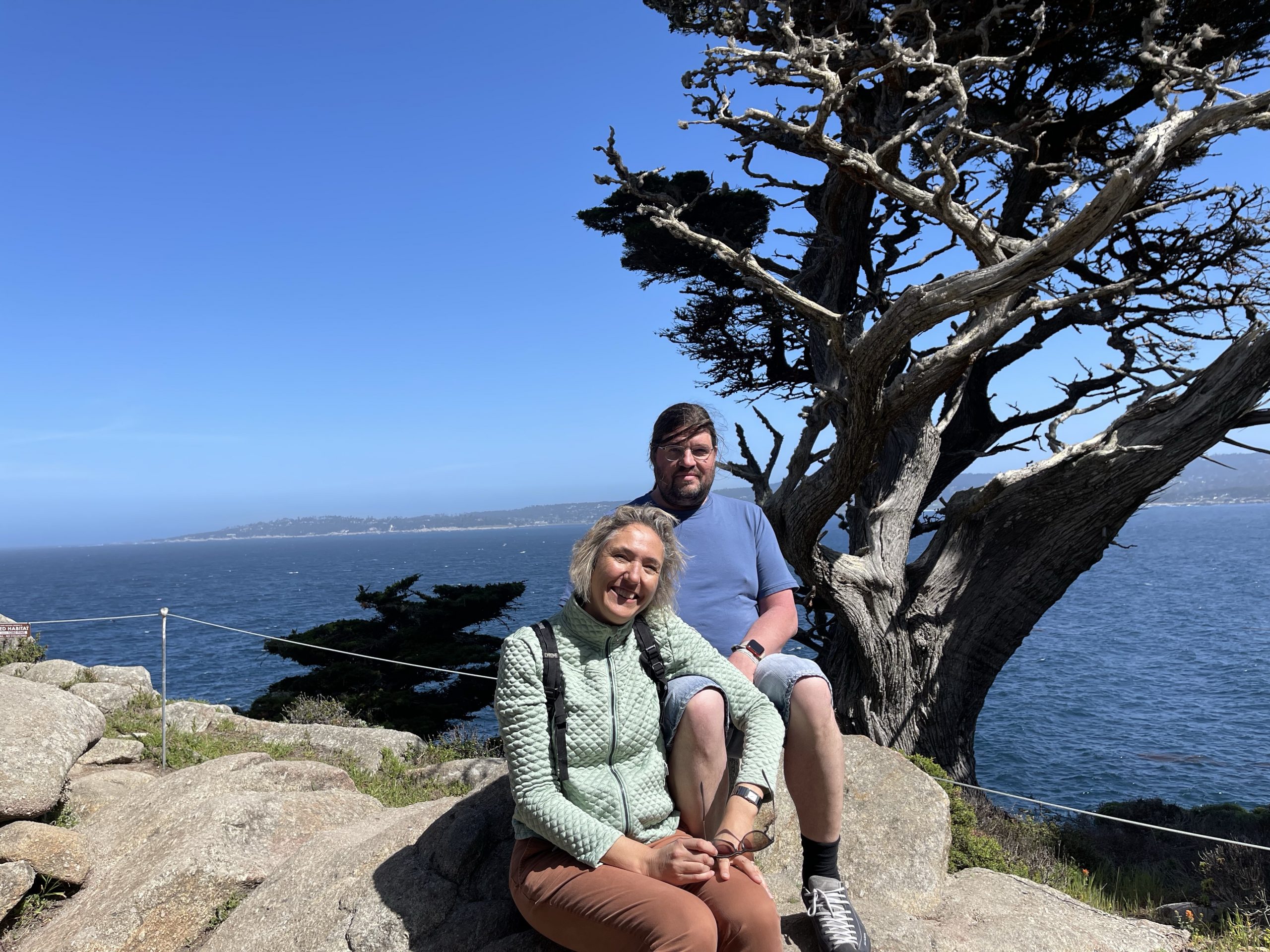 Dieses Wochenende sind wir in einem kleinen Nationalpark bei Carmel südlich von Monterey. Die Fahrt mit dem Auto dauert ca. 1,5 h. Punta de lobos ist der originale Name von den Spaniern, die Kalifornien von Mexiko aus besiedelt haben. Die ältesten Gebäude in Kalifornien sind die Missionen, dis sich wie eine Perlenschnur an der Küste hochziehen, immer einen Tagesmarsch voneinander entfernt. Lobos steht für Wölfe. Die Spanier haben die Rufe der Seelöwen für Wölfe gehalten. Mit ein bisschen Glück kann man hier neben Seelöwen auch Seeotter beobachten. Berühmt für Point Lobis sind die wilden Zypressen, die es nur noch neben einer weiteren Stelle in Kalifornien gibt. Die Zypressen stehen als Sinnbild für den Konflikt zwischen Wasser und Land und sind übersäht mit Flächten und manchmal Algen.