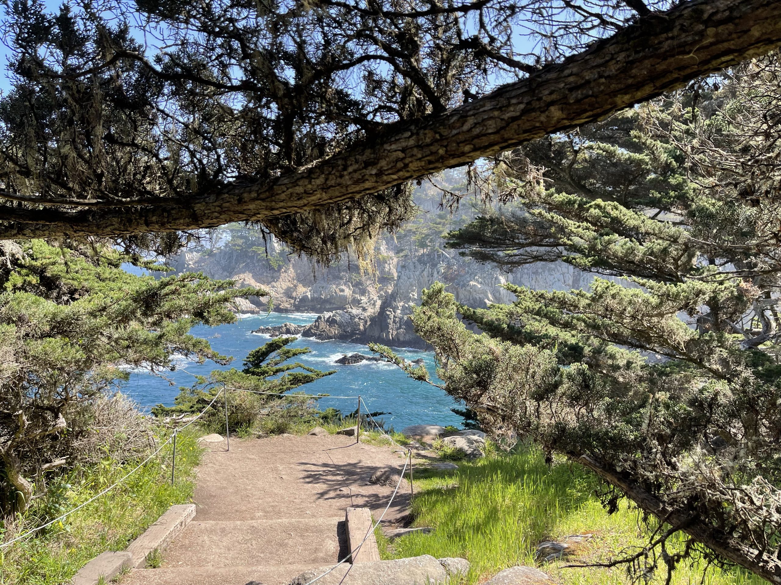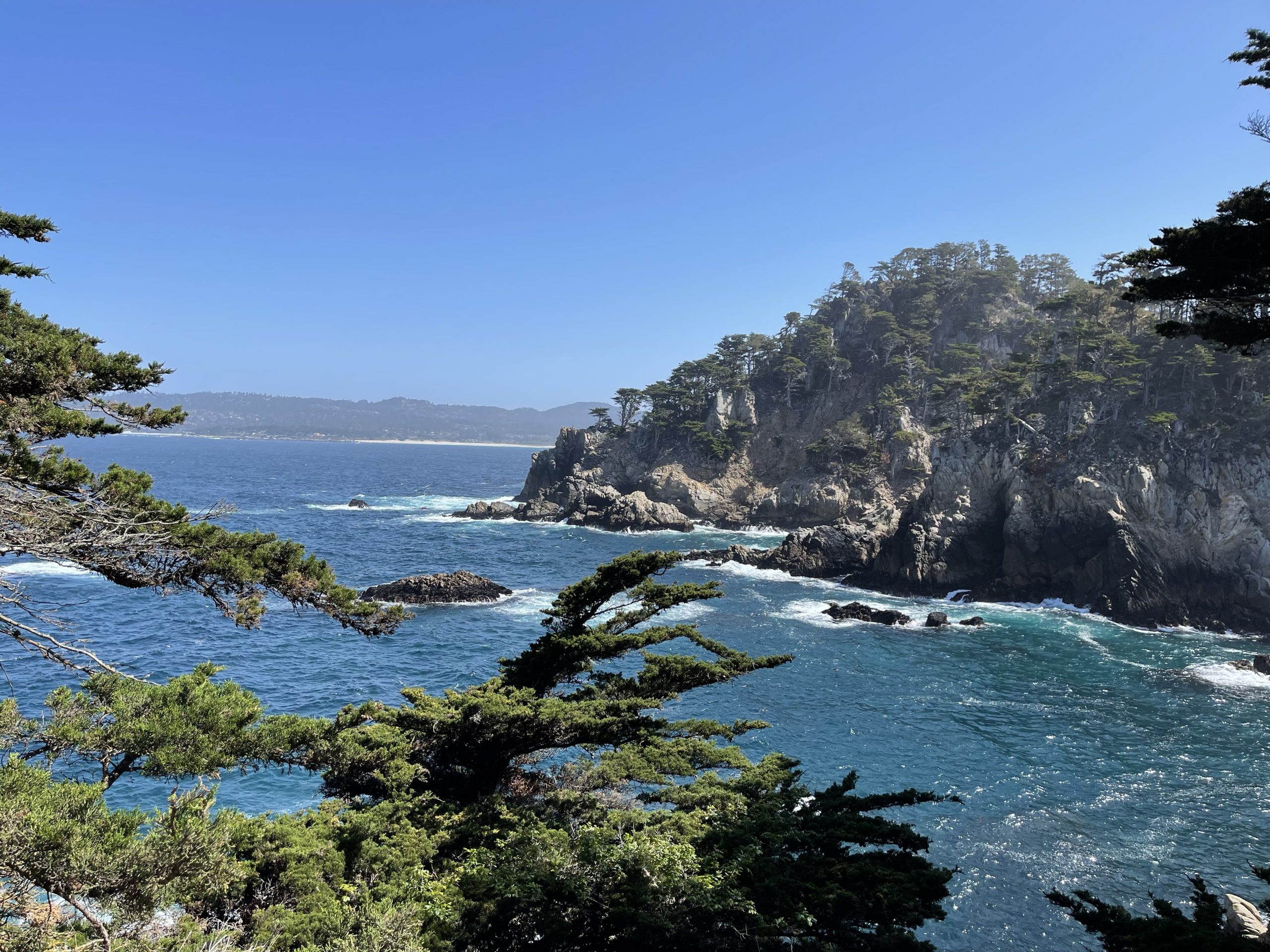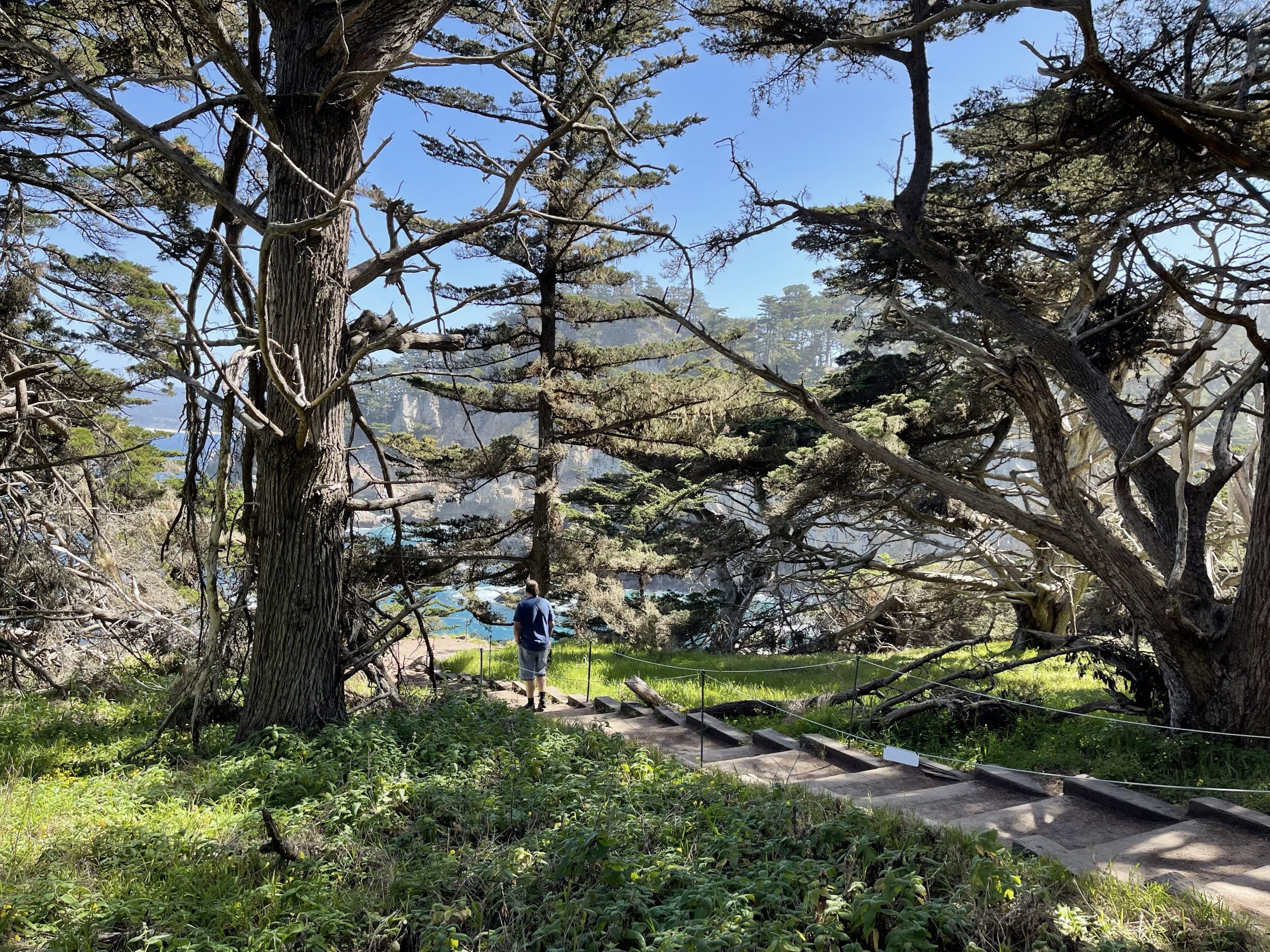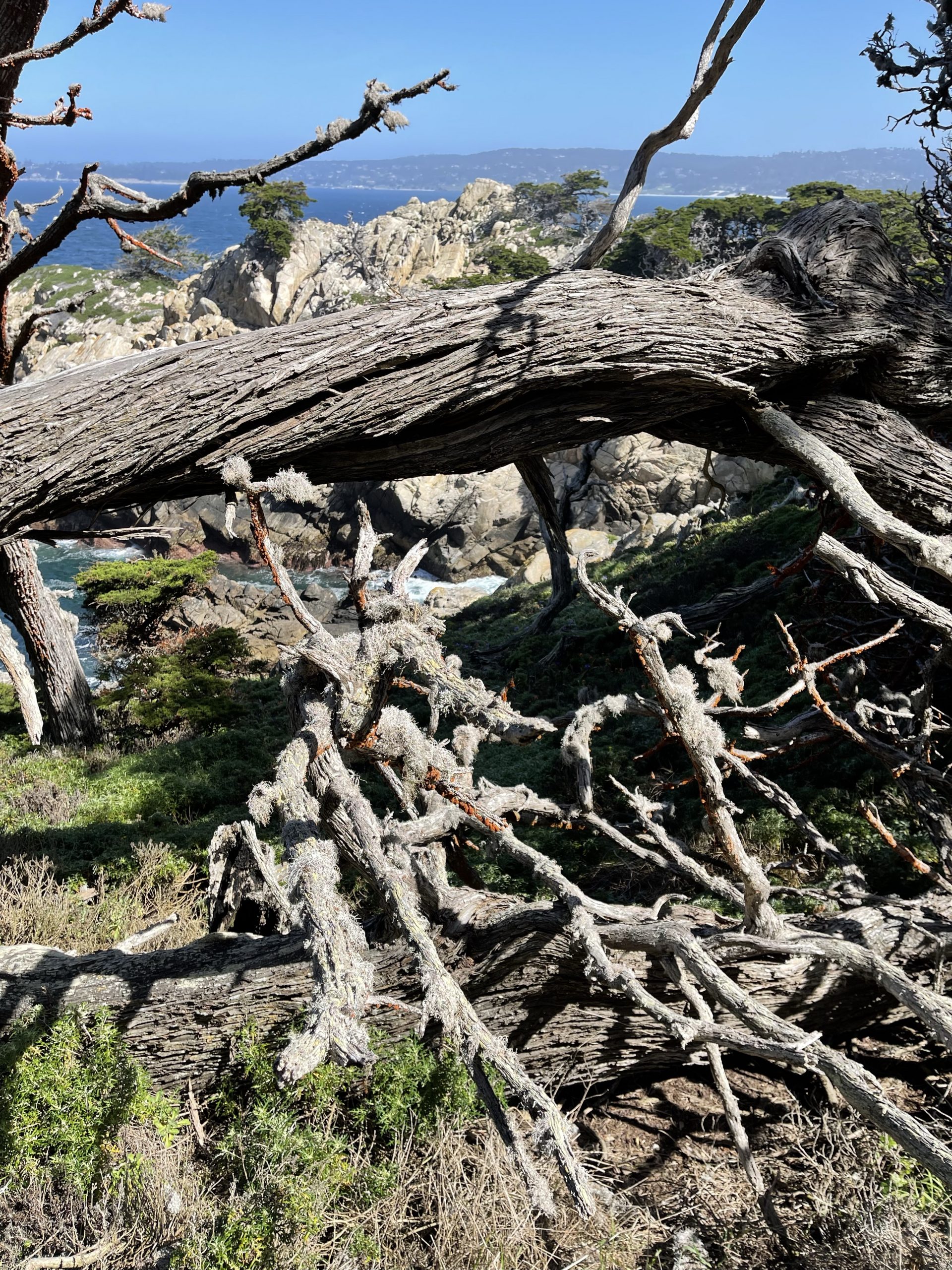 Dieses Wochenende sind wir in einem kleinen Nationalpark bei Carmel südlich von Monterey. Die Fahrt mit dem Auto dauert ca. 1,5 h. Punta de lobos ist der originale Name von den Spaniern, die Kalifornien von Mexiko aus besiedelt haben. Die ältesten Gebäude in Kalifornien sind die Missionen, dis sich wie eine Perlenschnur an der Küste hochziehen, immer einen Tagesmarsch voneinander entfernt. Lobos steht für Wölfe. Die Spanier haben die Rufe der Seelöwen für Wölfe gehalten. Mit ein bisschen Glück kann man hier neben Seelöwen auch Seeotter beobachten. Berühmt für Point Lobis sind die wilden Zypressen, die es nur noch neben einer weiteren Stelle in Kalifornien gibt. Die Zypressen stehen als Sinnbild für den Konflikt zwischen Wasser und Land und sind übersäht mit Flächten und manchmal Algen.