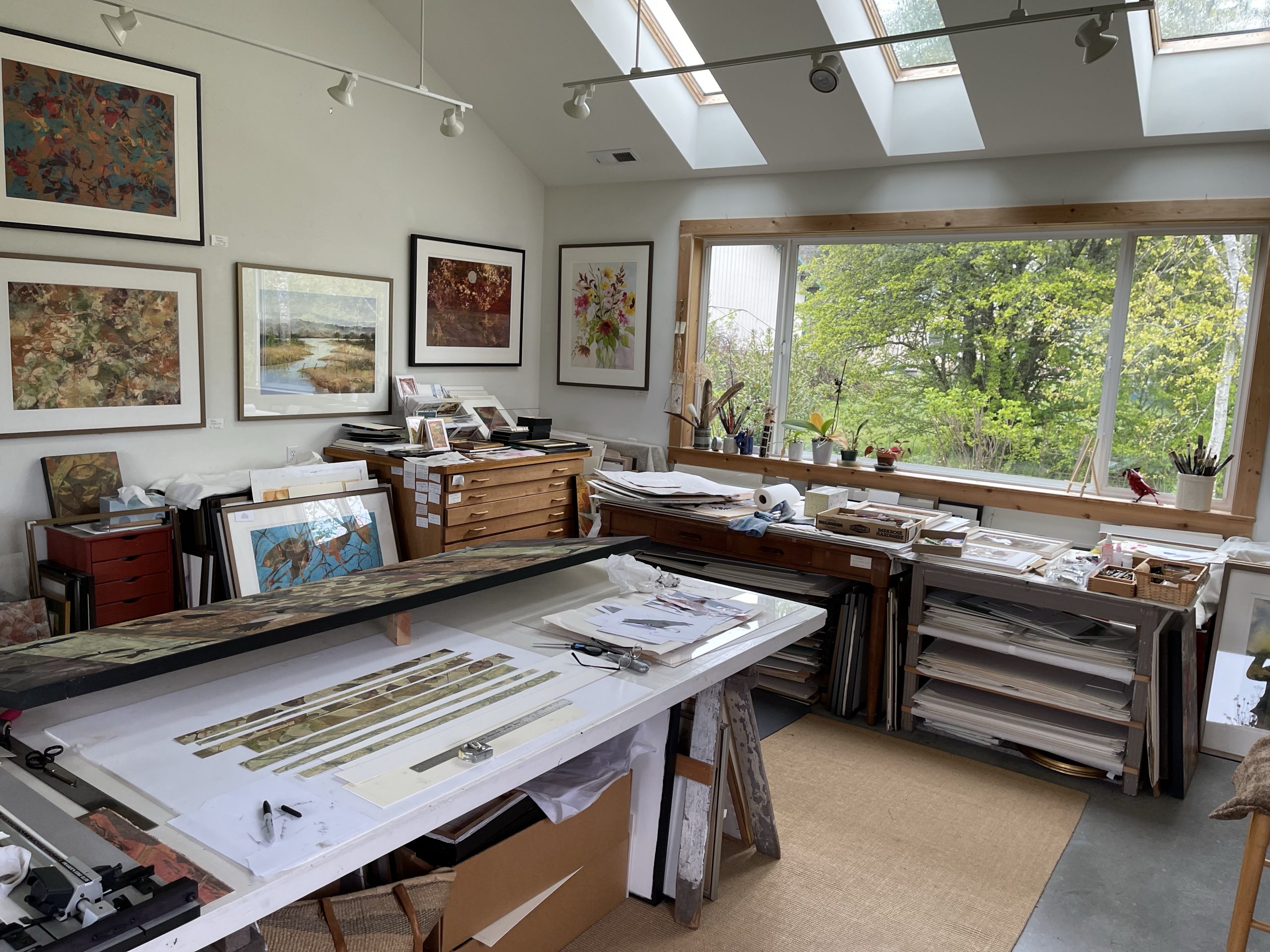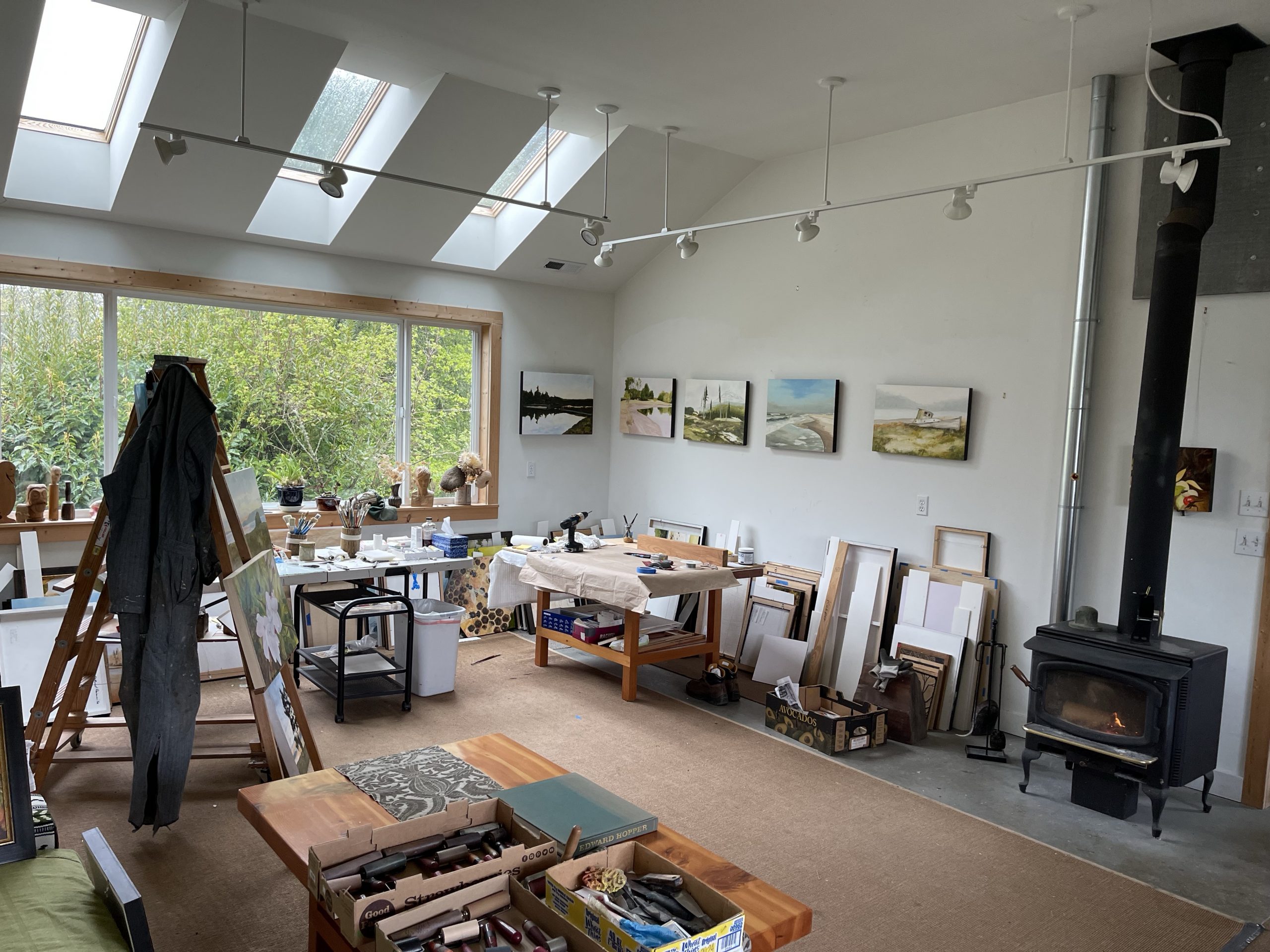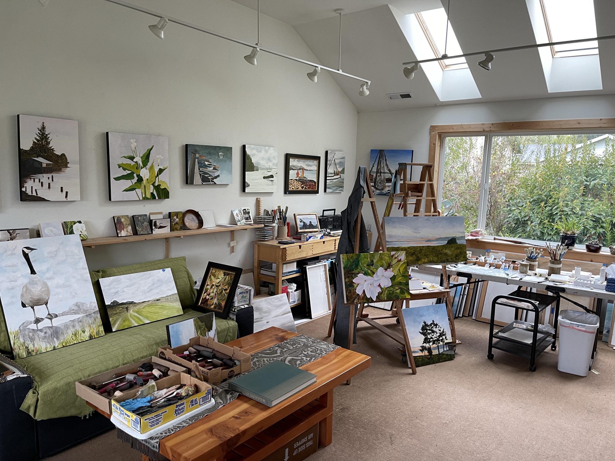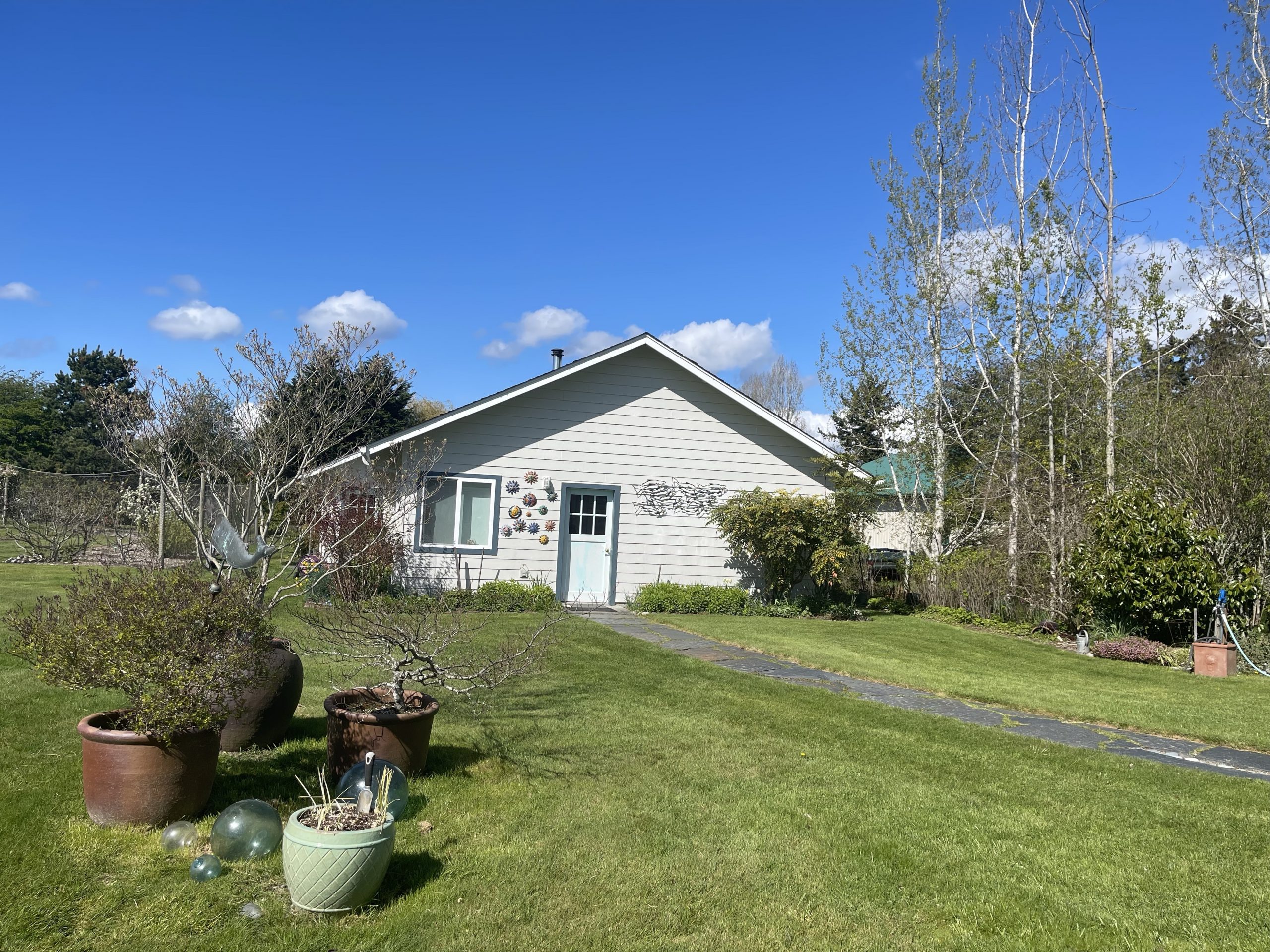 Zum Haus gehört ein großer Garten, der bis ans Wasser reicht. Dazu gehören auch große Gemüsebeete und viele Blumen. Da das Wetter nicht gut war, habe ich nicht viele Fotos gemacht. Neben dem Haus sind die Studios von meinem Onkel Hartmut und meiner Tante Ilse. Beide malen und verkaufen ihre Bilder auf diversen Shows. Meine Tante macht auch Monotype Drucke. Jetzt im Mai war gerade eine Studiotour auf der Insel, an der viele Künstler teilnehmen. Beide haben gut verkauft. Mein Onkel ist 85 geworden, meine Tante ist über 80.