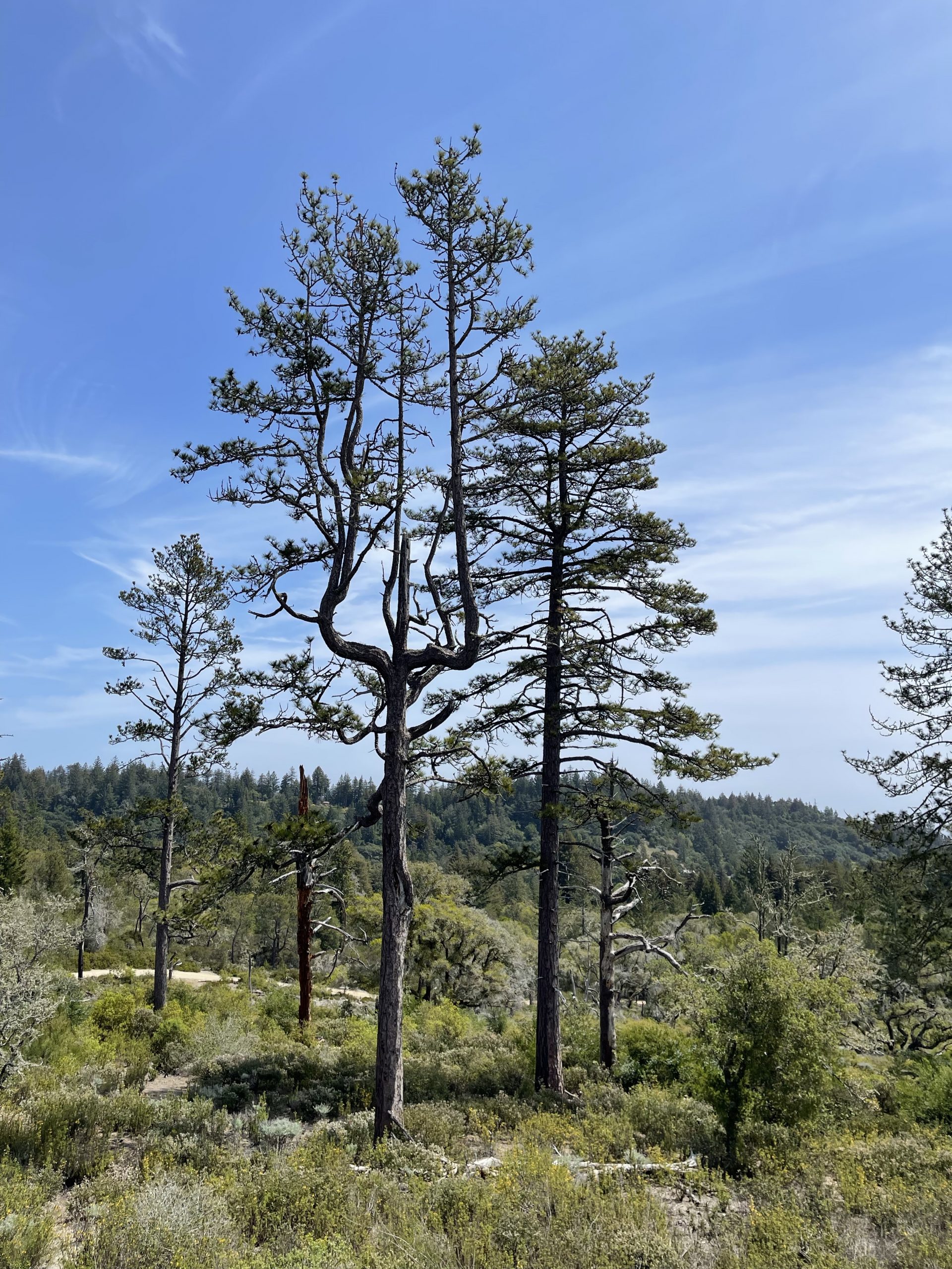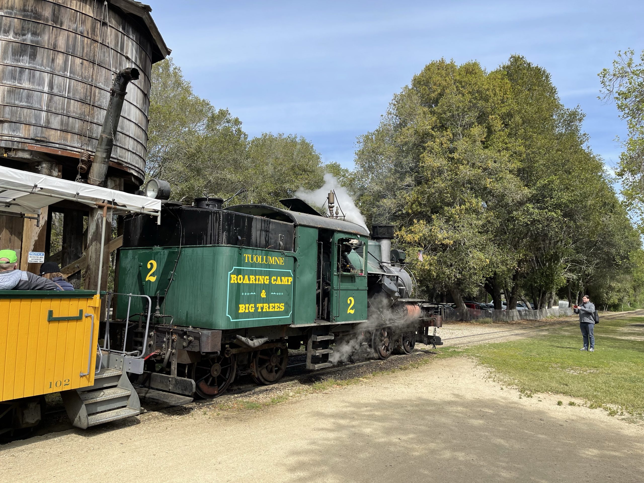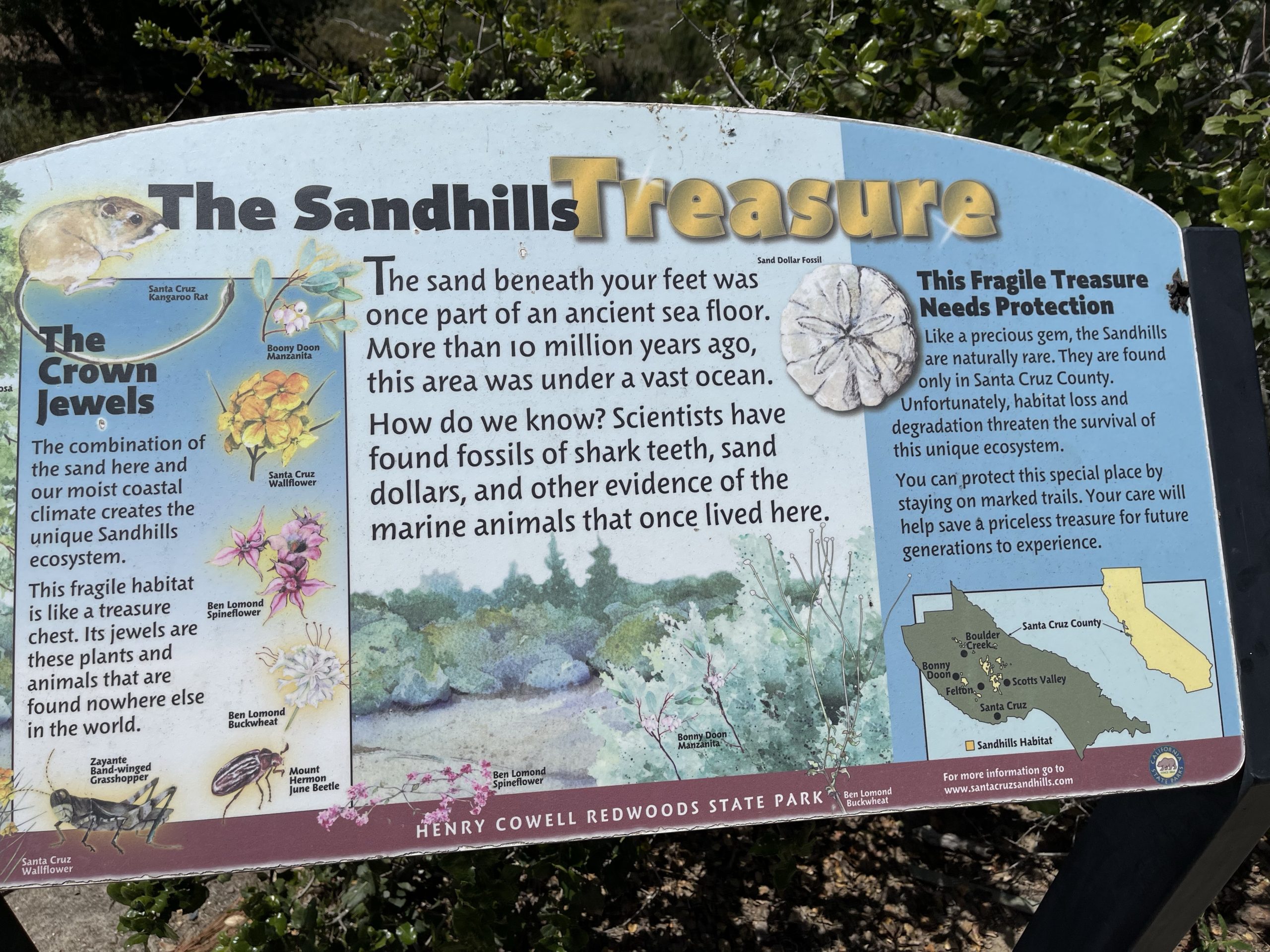 An meinem Geburtstag am 27. April waren wir in diesem State Park in der Nähe von Santa Cruz, also nicht weit vom Pazifik und ca. 1 h südlich von Fremont. Bevor wir die Wanderung beginnen, entdecken wir einen Dampfzug: Die Roaring Camp & Big Trees Railroad ist eine US-amerikanische Schmalspur-Museumseisenbahn, die über eine 5,25 km lange Steilstrecke durch den Mammutbaum-Wald den Gipfel des nahegelegenen Bear Mountain erklimmt. Dann beginnen wir die Wanderung: Redwoods, die bis zu 1400-1800 Jahr alt sind, einen Durchmesser bis zu 4.9 m haben und eine Höhe von 91 m. Giganten. Da sieht der „kleine“ Dag wie ein Spielzeug aus. So wandern wir durch den Wald und kommen unerwartet an eine Lichtung mit sandigem Untergrund und Sträuchern. Hier muss es gebrannt haben, da wir Baumskelette sehen, in denen unzählige Spechte hausen. Auf einer Aussichtsplatform finden wir heraus, dass wir uns auf einer ehemaligen Sanddüne befinden. Archeäologen haben hier Versteinerungen von Meerstieren und -muscheln gefinden. Wir sind fasniziert. Schon bald beginnt wieder der Wald, der diese Sanddüne umrandet. Im Anschluss an der Wanderung gehen wir noch in ein mexikanisches Restaurant in Santa Cruz, dort essen wir Enchiladas mit einer dunklen Mole-Schokoladensauce. Eine Spezialität aus der Stadt Oaxaca.