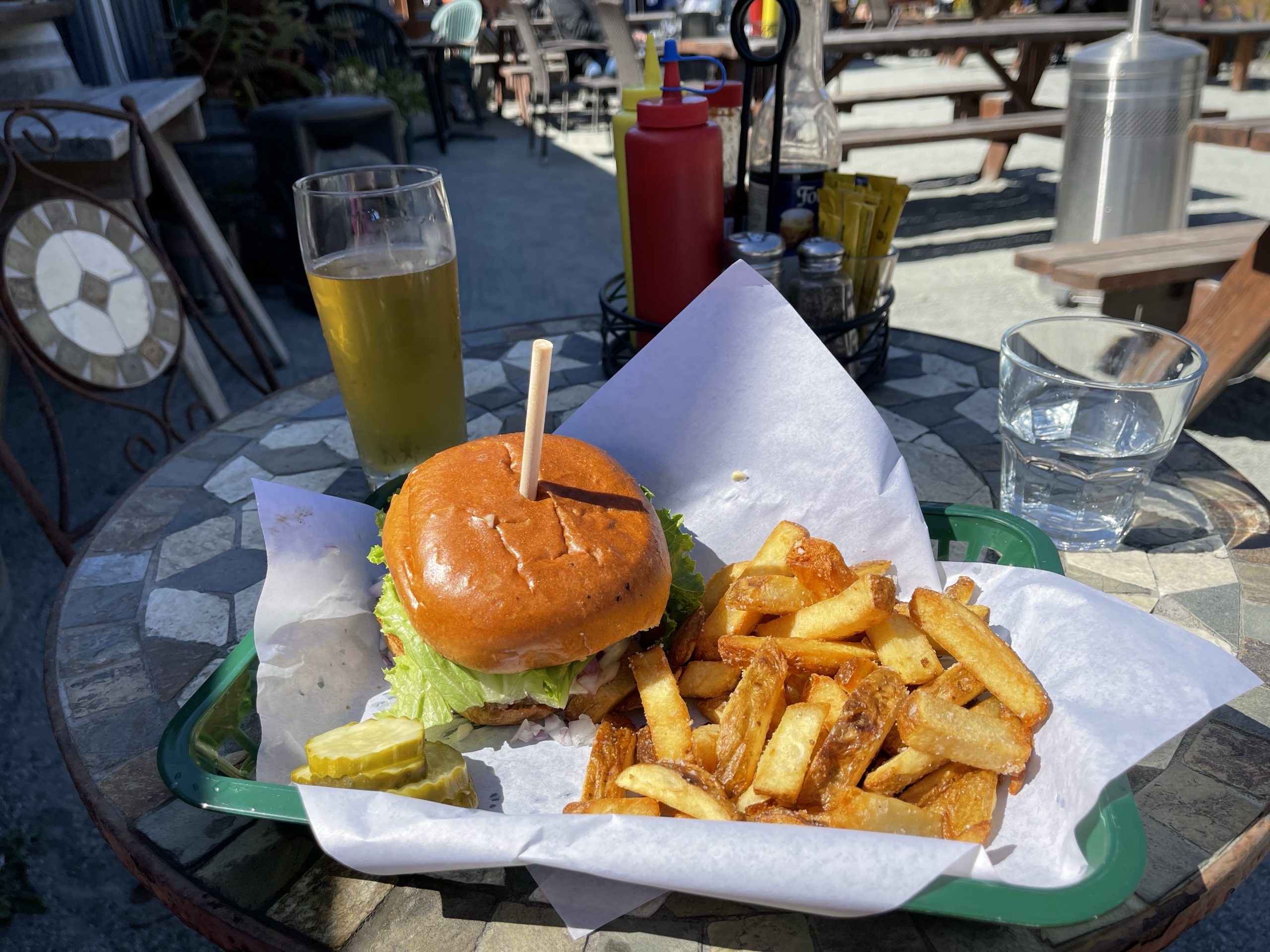 Nach der Wanderung fahre ich weiter die Küste herunter, vorbei an einem Leuchtturm im Nebel. Früher sind hier wegen den Nebels viele Schiffe untergegangen. Dann kommt die Sonne endlich durch und ich esse einen Burger mit selbstgebrautem Bier dazu. Lifemusik ist auch dabei.