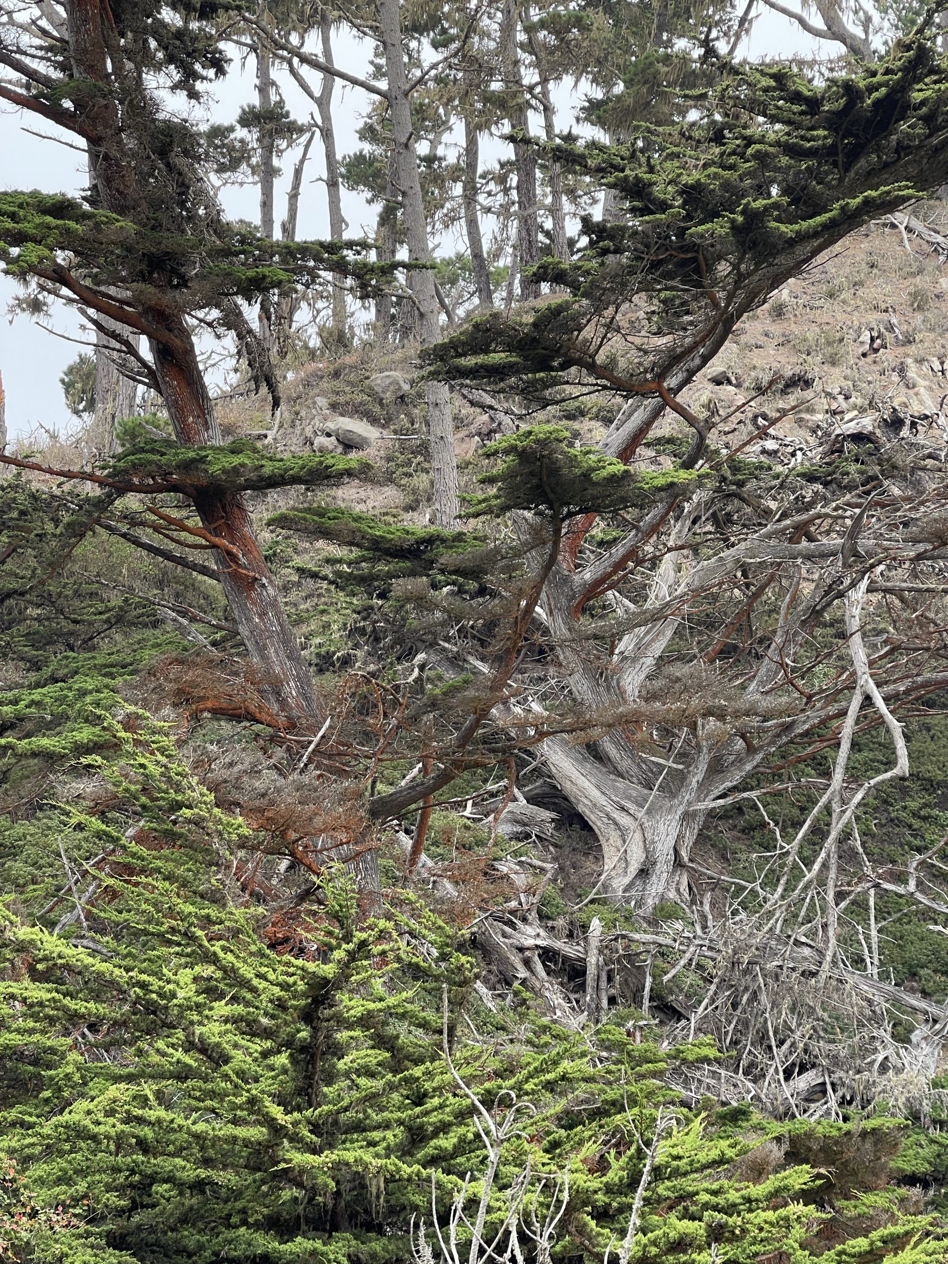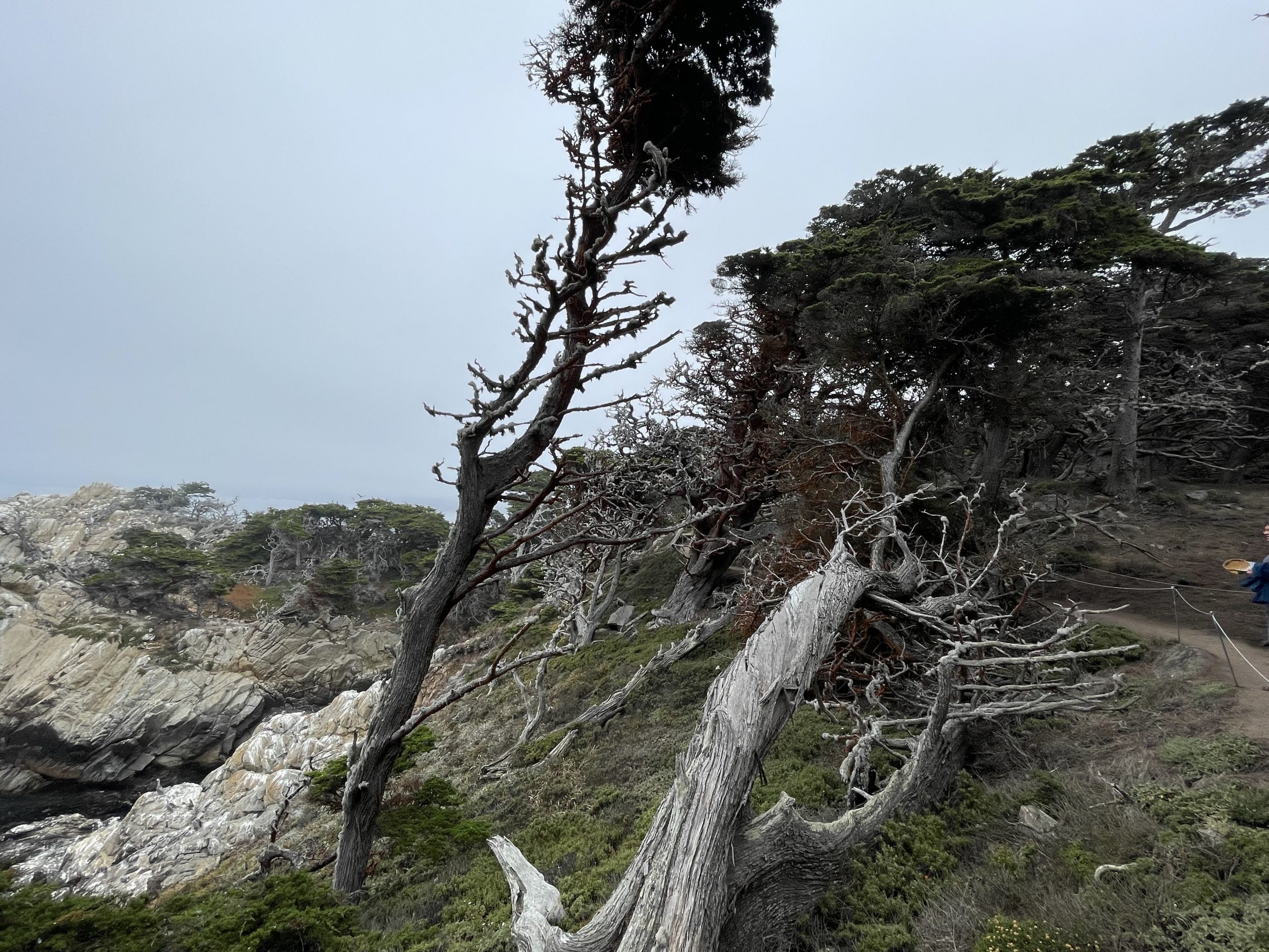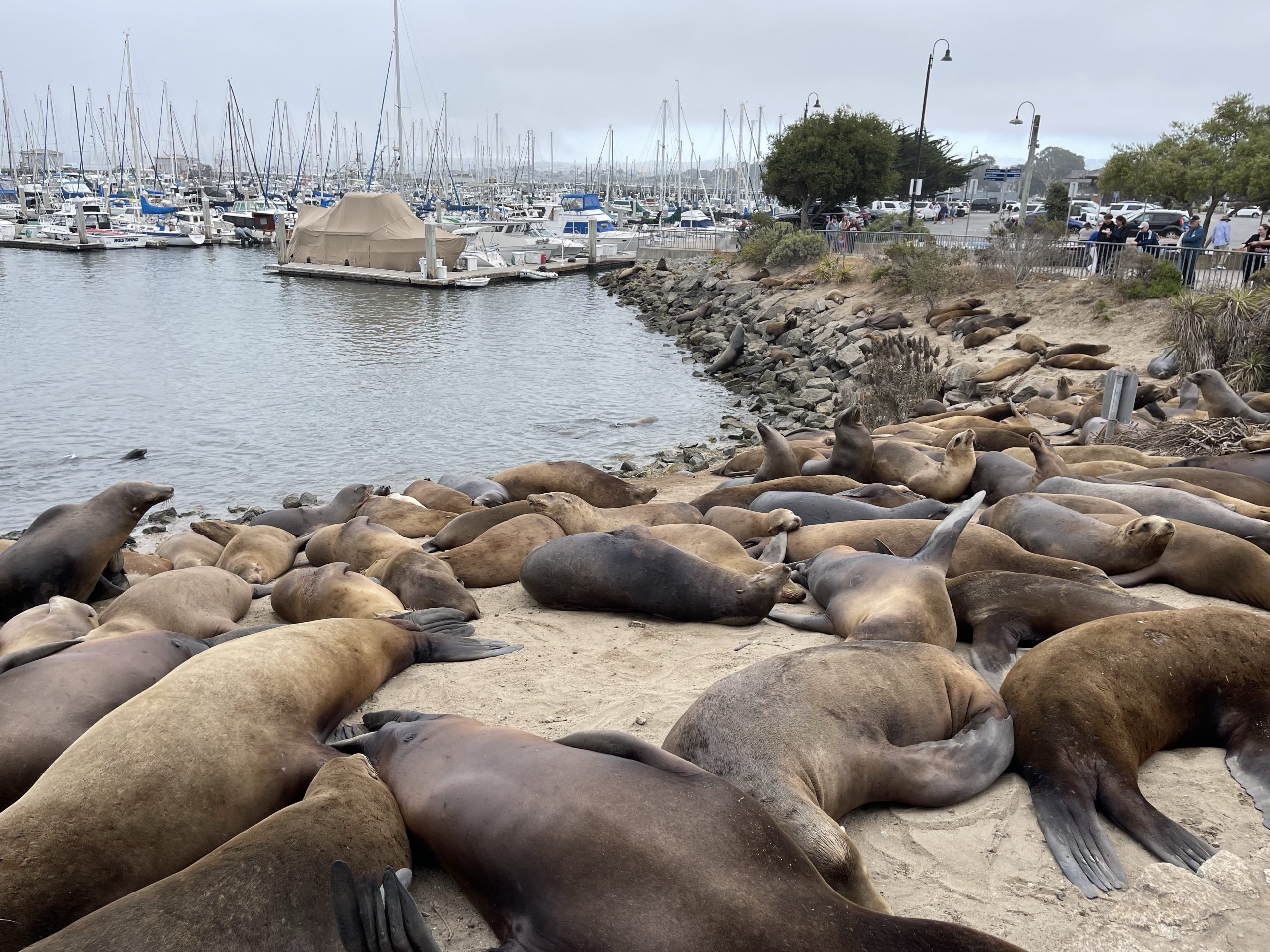 Wir sind 2 Tage in Monterey und Carmel, 2 Küstenstädte 2 h südlich von San Francisco. Wir fahren den 17 mile drive entlang und sehen Seehunde, Seeotter, Pelikane, Möven und Komorane. Wir übernachten im Hotel Hidden Valley in Carmel Valley Village. Sobald man die Küste verlässt, wird es heiß und sonnig. Das Hotel ist im typischen Motelstil angelegt, vor jedem Zimmer ein Parkplatz und ein eigener, direkter Zugang zum Zimmer. In der Mitte ist ein Pool. Am nächsten Tag machen wir erst eine Wanderung im Garland Park, hier ist es trocken und heiß. In einem Laden und Cafe mit organischen Produkten machen wir einen Lunch Stopp. Hinter dem Cafe ist ein großer Garten angelegt. Nachmittags fahren wir dann an die Küste zum Point Lobos State Park, der berühmt ist für seine alten Zypressen. Erst wurden im 19 Jahrhundert die Seeotter wegen ihres Felles beinahe ausgerottet. Daraus resultierte ein Zuwachs der Abalone Muscheln, eine Delikatesse, nach der getaucht worden ist. Inzwischen sind sowohl Seeotter als auch Abalone unter Naturschutz. Bevor wir zurückfahren in die Bay Area, machen wir einen Stopp in Fishermans Wharf in Monterey. Dort hören wir schon von weitem die Sea Lions, die es sich am Ufer bequem gemacht haben.