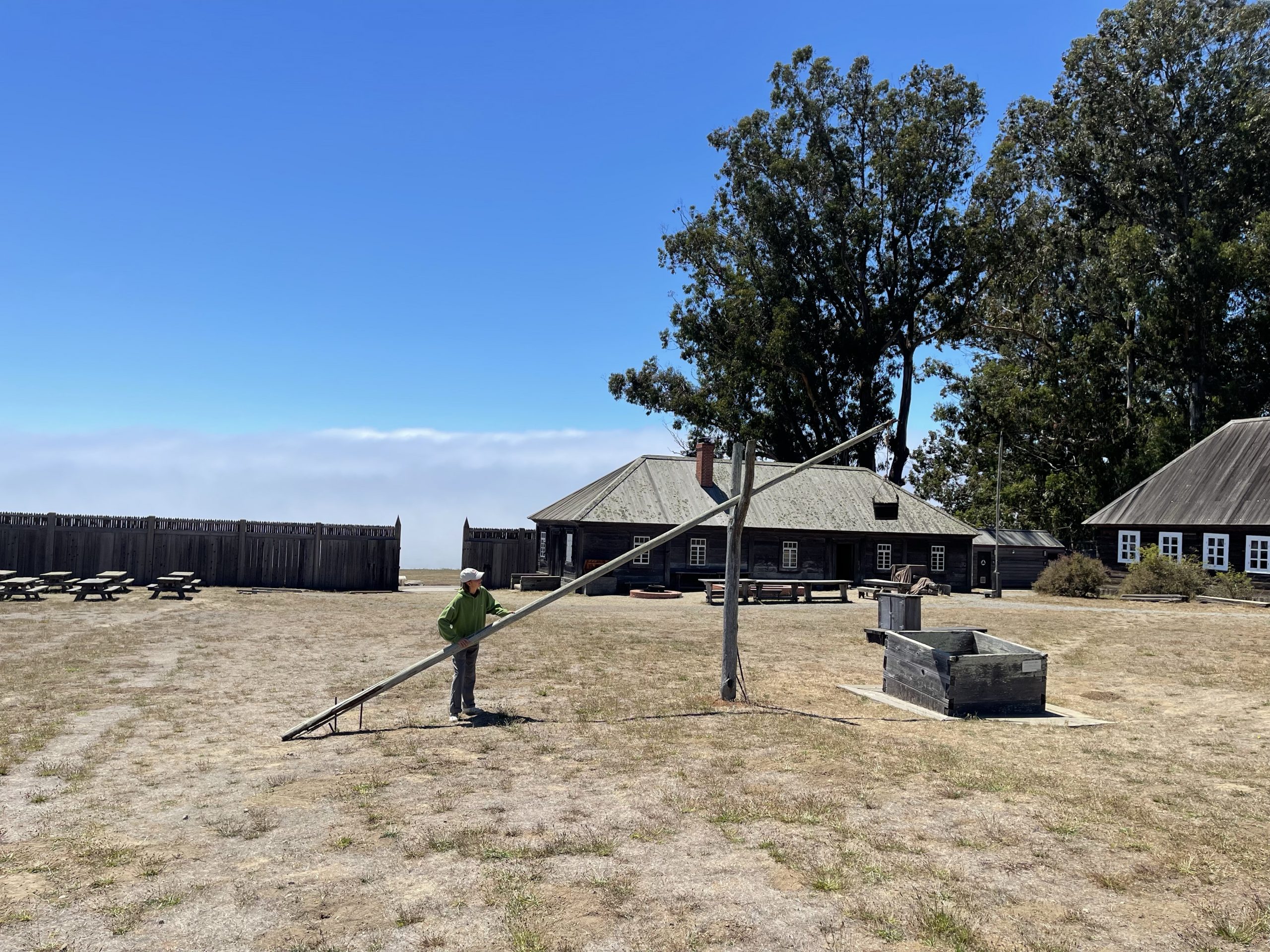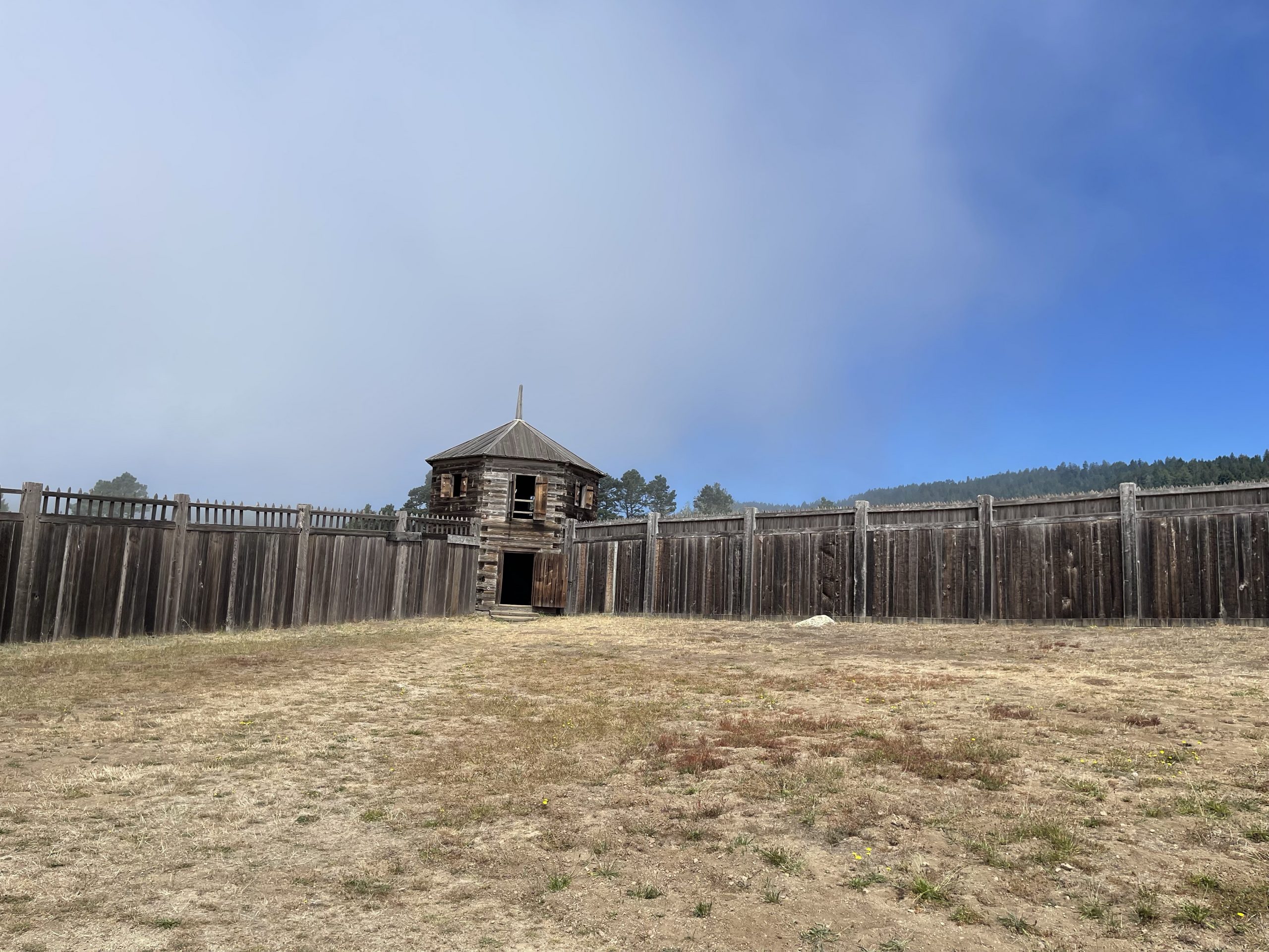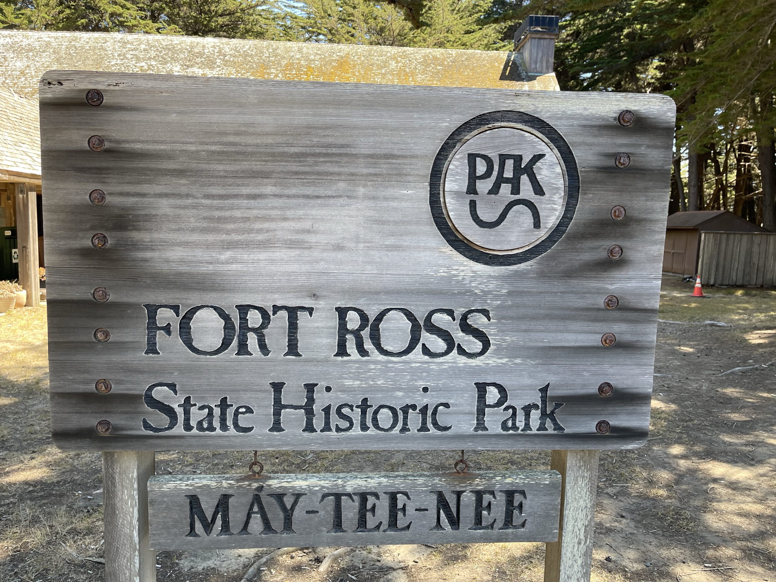 Heute sind wir in einem State Historic Park, der 1906 gegründet wurde und damit einer der Ältesten in Kalifornien ist. An der Sonomaküste gelegen war hier die südlichste Siedlung der Russen in Amerika. Fort Ross wurde 1820 gegründet, von Russen, die sich in Alaska bereits angesiedelt hatten (die Russen kamen über die Beringstraße nach Alaska). Alaska gehörte damals zu Russland und wurde erst später von den Amerikanern abgekauft. Das Fort sollte dem Getreideanbau dienen, das dann die Russen in Alaska versorgte, um Brot zu backen. Ebenso wurden Seeotter gejagt, deren Felle an China verkauft wurden. Ein Fell enstprach dem Wert eines Jahreslohns von einem Farmer. Für das Jagen brachten die Russen Eskimos, Aleuten aus Alaska, mit. Das Fort wurde an einem Standort errichtet, an dem es bereits ein Dorf der dort ansässigen kalifornischen Indianer gab. Unten auf dem Schild steht der Name des indianischen Dorfes. Die Russen trieben Handel mit den Spaniern und Mexikanern, deren nördlichste Mission ca. 20 Meilen südlich war, in Sonoma.