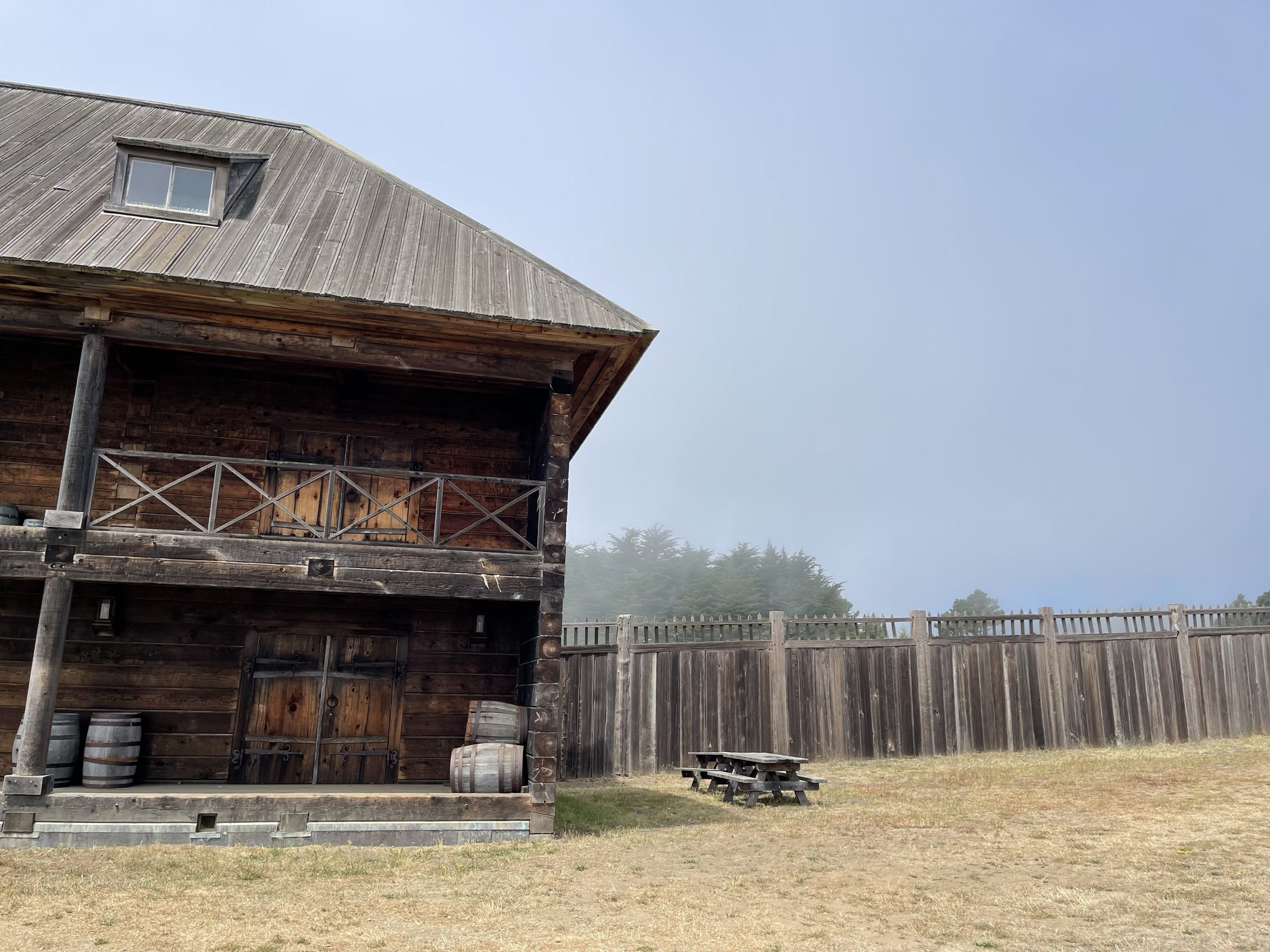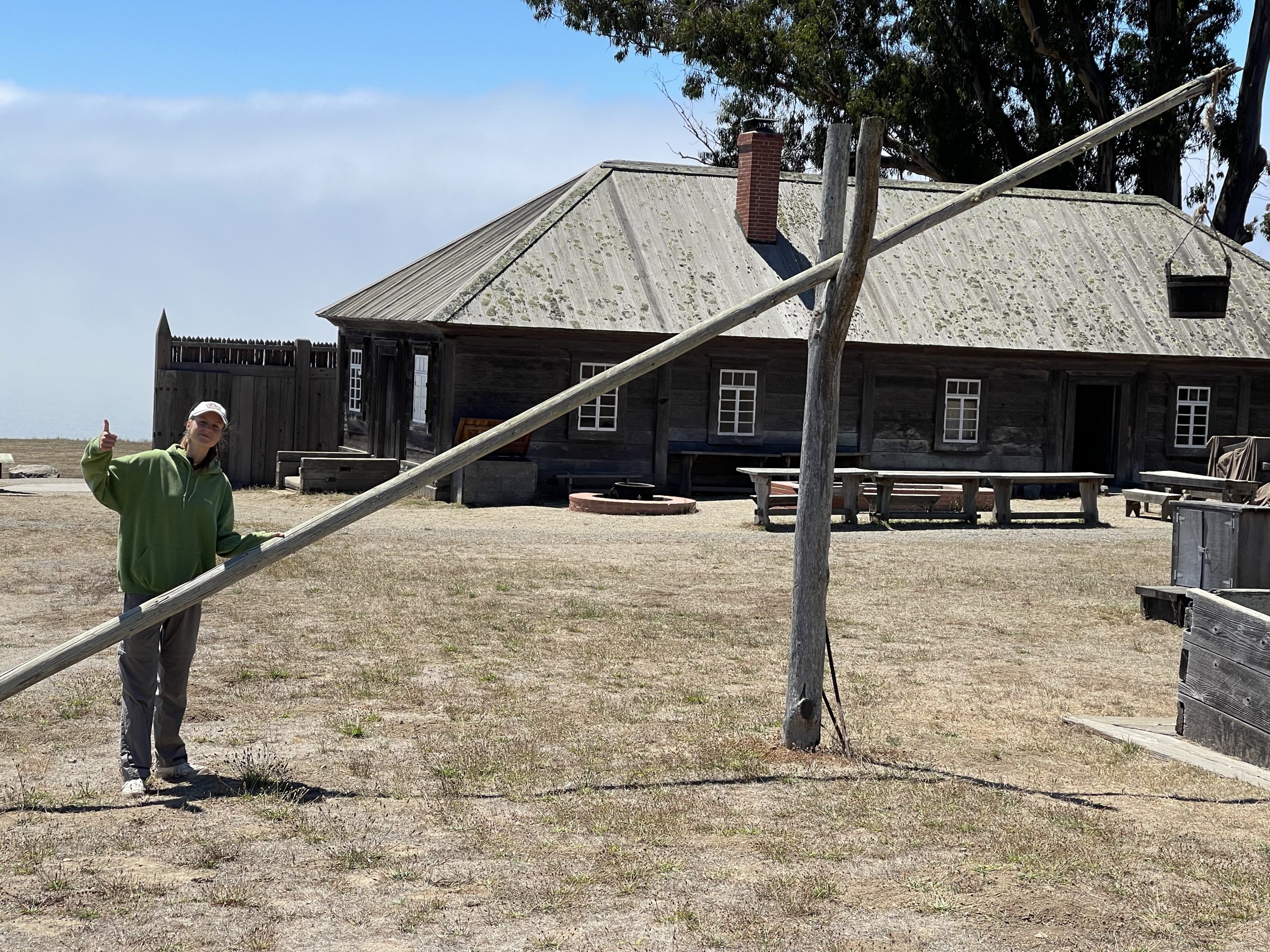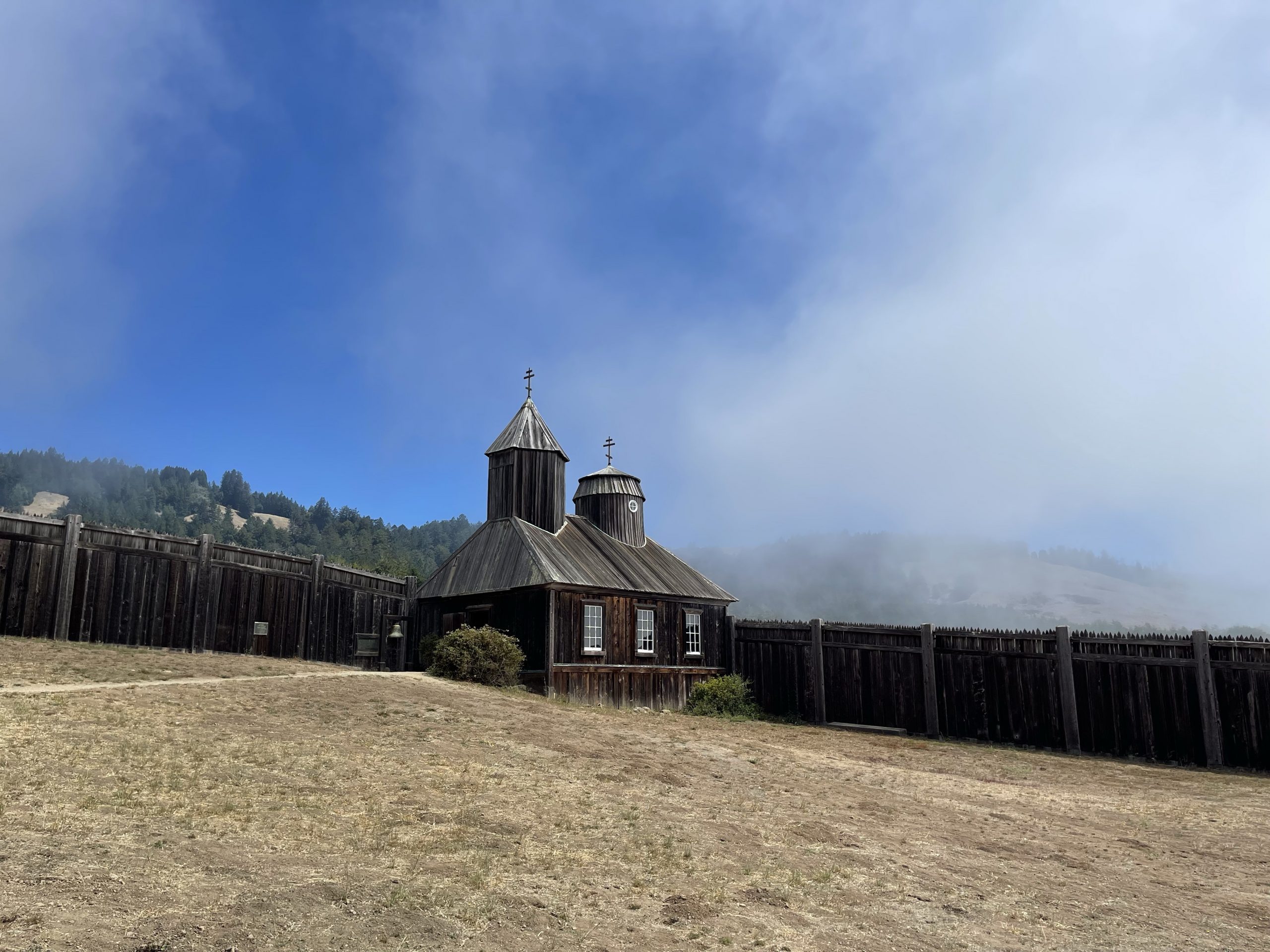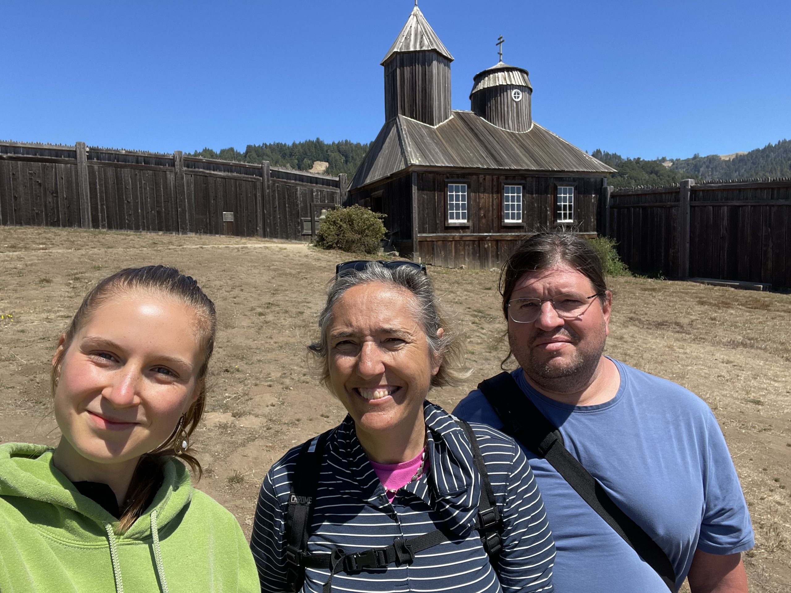 Heute sind wir in einem State Historic Park, der 1906 gegründet wurde und damit einer der Ältesten in Kalifornien ist. An der Sonomaküste gelegen war hier die südlichste Siedlung der Russen in Amerika. Fort Ross wurde 1820 gegründet, von Russen, die sich in Alaska bereits angesiedelt hatten (die Russen kamen über die Beringstraße nach Alaska). Alaska gehörte damals zu Russland und wurde erst später von den Amerikanern abgekauft. Das Fort sollte dem Getreideanbau dienen, das dann die Russen in Alaska versorgte, um Brot zu backen. Ebenso wurden Seeotter gejagt, deren Felle an China verkauft wurden. Ein Fell enstprach dem Wert eines Jahreslohns von einem Farmer. Für das Jagen brachten die Russen Eskimos, Aleuten aus Alaska, mit. Das Fort wurde an einem Standort errichtet, an dem es bereits ein Dorf der dort ansässigen kalifornischen Indianer gab. Unten auf dem Schild steht der Name des indianischen Dorfes. Die Russen trieben Handel mit den Spaniern und Mexikanern, deren nördlichste Mission ca. 20 Meilen südlich war, in Sonoma.